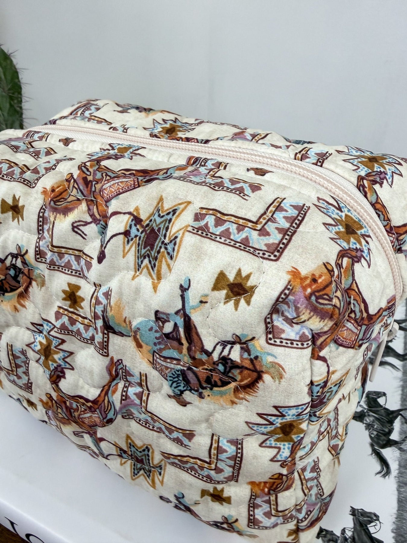 Every stitch tells a story. Our quilted makeup bag is lovingly handcrafted in Texas, combining timeless quilting with practical design. With a roomy compartment and soft western-inspired patterns, it’s built to hold your beauty essentials in style. Durable, washable, and made with care—this bag is made to go wherever life takes you.
