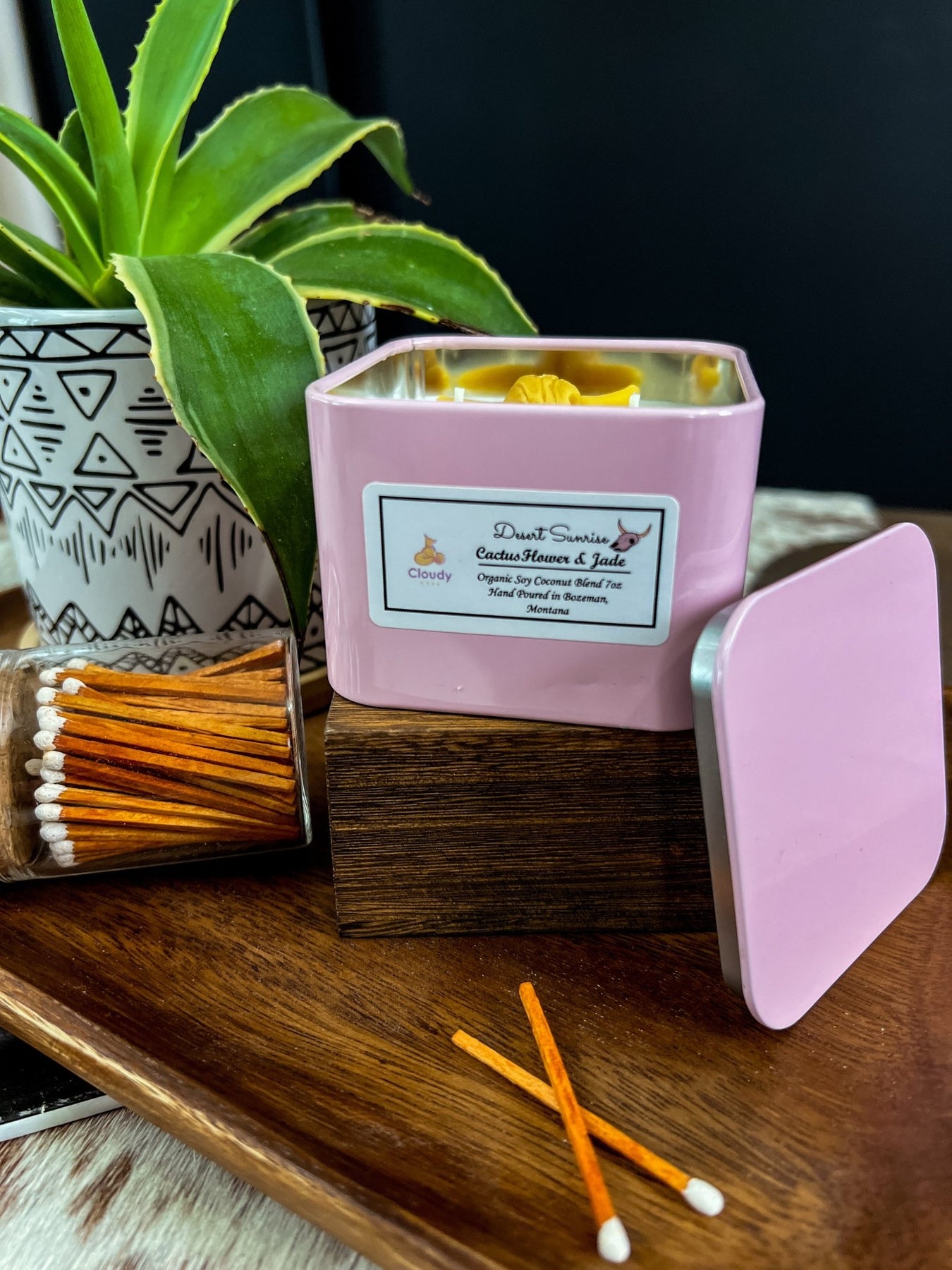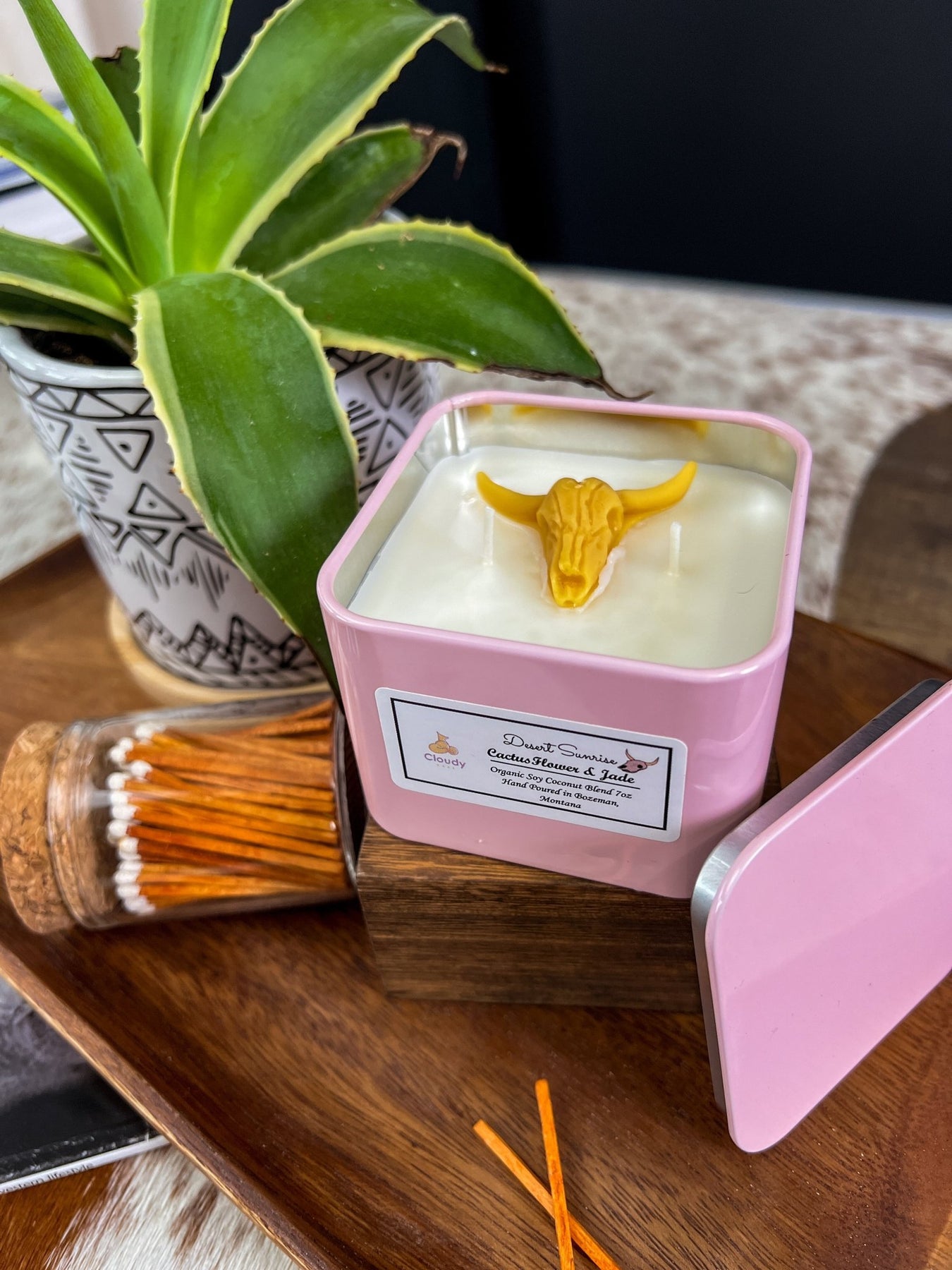 Indulge in the peaceful oasis of the Desert Sunrise candle. A perfect blend of agave and aloe top notes, chrysanthemum petal oil middle notes, and earthy patchouli base notes. This vegan soy-coconut wax candle also comes with a bison skull wax melt for an added touch of tranquility.