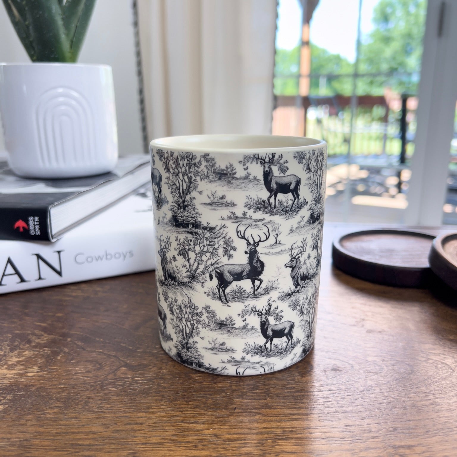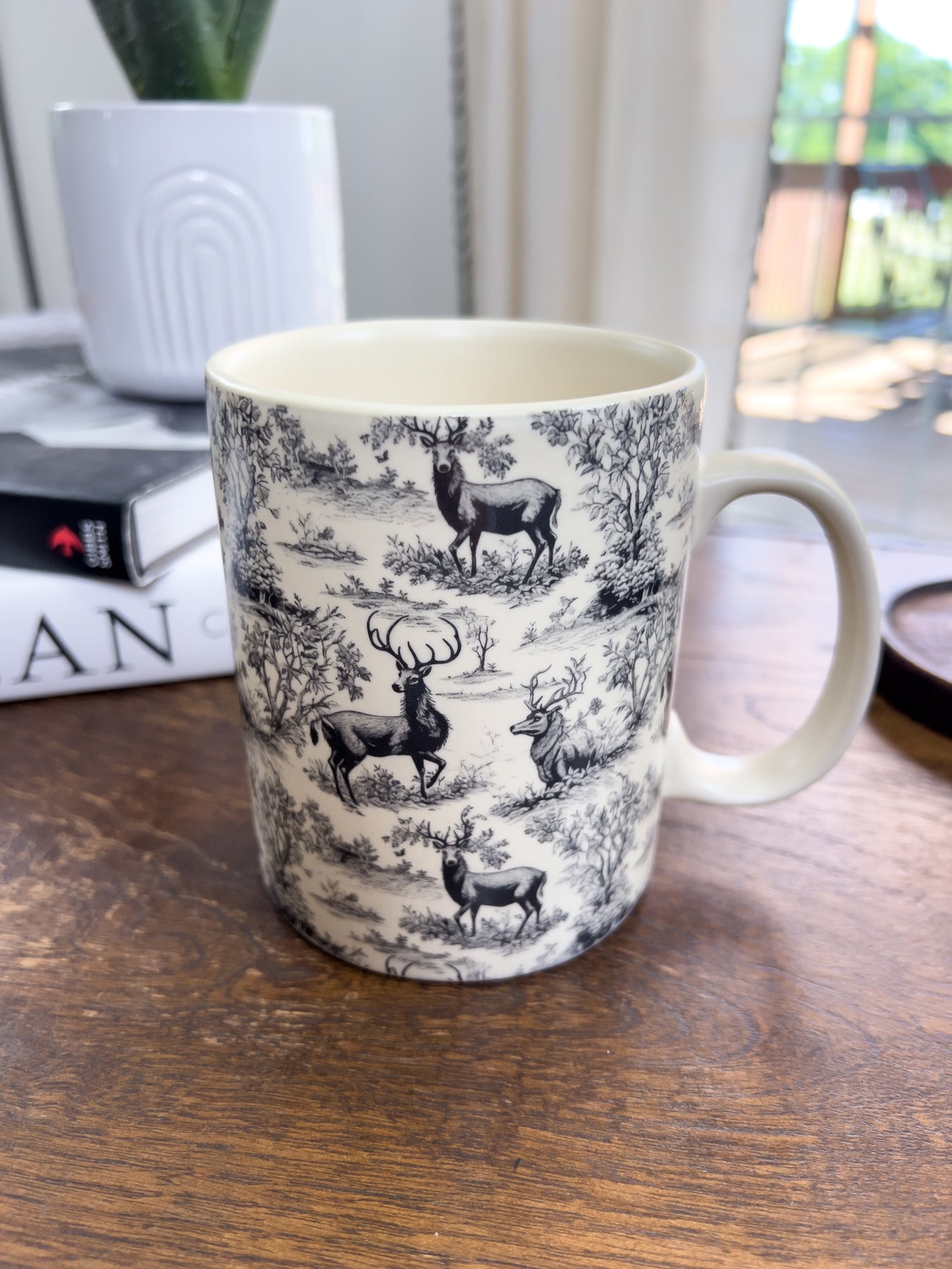 Made of stoneware, this 20 oz mug boasts a full wrap-around toile pattern of deer and trees. Inspired by vintage home decor, it is microwave, oven, dishwasher, and food safe. Perfect for everyday use!