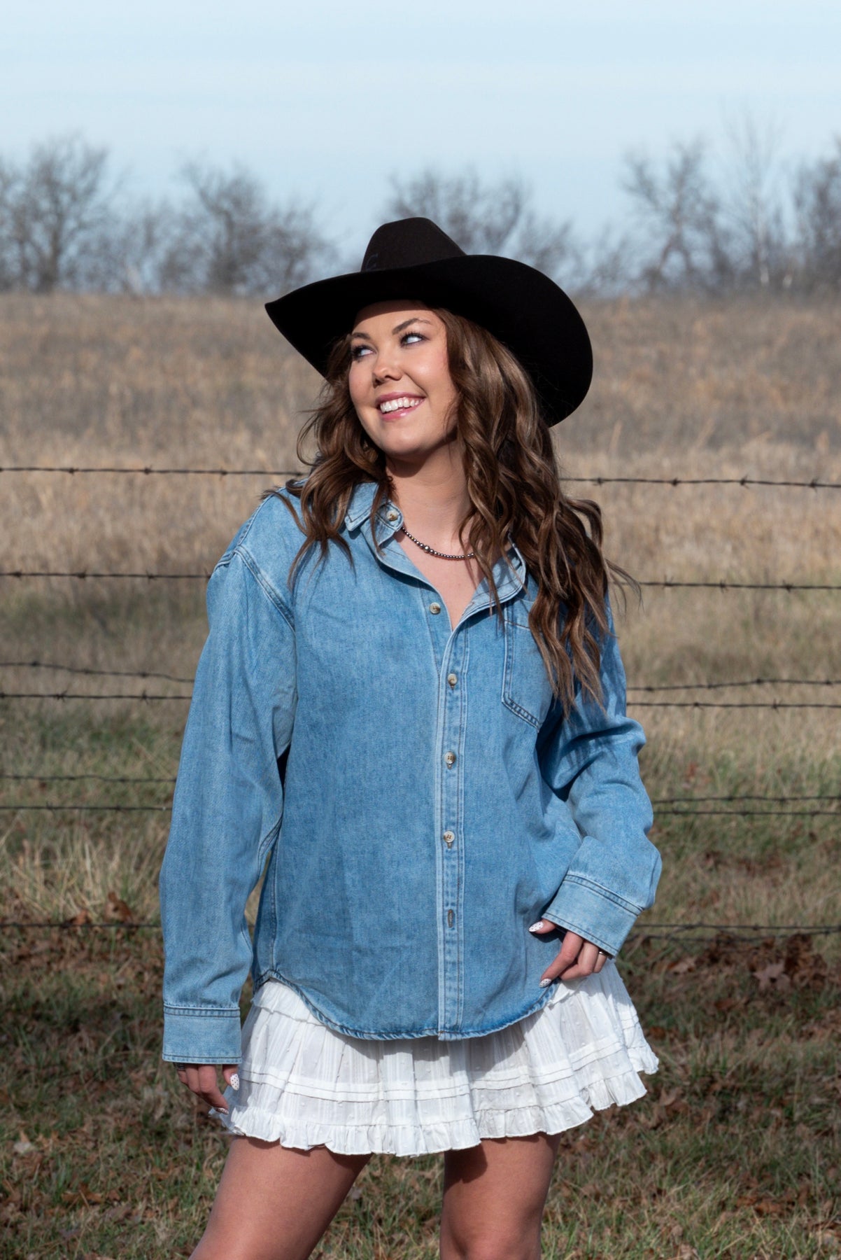 Meet your new favorite denim-relaxed, easy, and made for everyday wear. The medium wash gives it that lived in look, while the oversized fit keeps things comfy. With classic details like the button down front and chest pocket, it’s perfect on its own or layered for that effortless Western vibe.