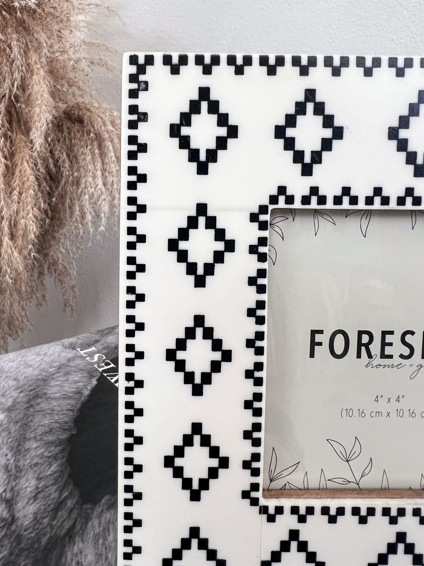 Add a timeless touch to your space with this square picture frame, featuring a black Southwest-inspired pattern printed over white resin. The classic black and white design complements any decor, making it perfect for displaying on a desk, shelf, or mantel. Designed with versatility in mind, it includes an easel back and a sawtooth hanger so you can showcase your favorite memories on a tabletop or hang them on the wall with ease.
