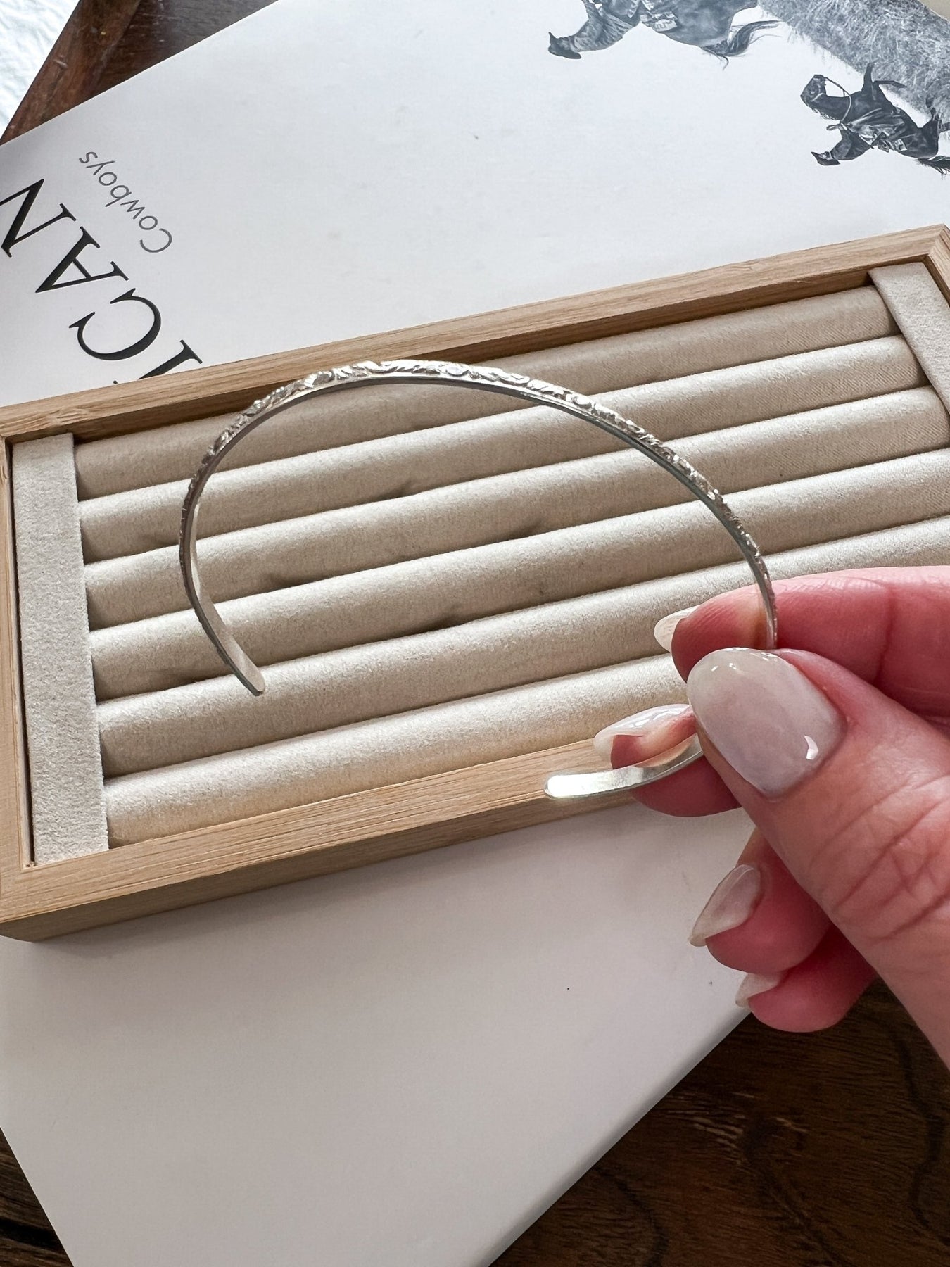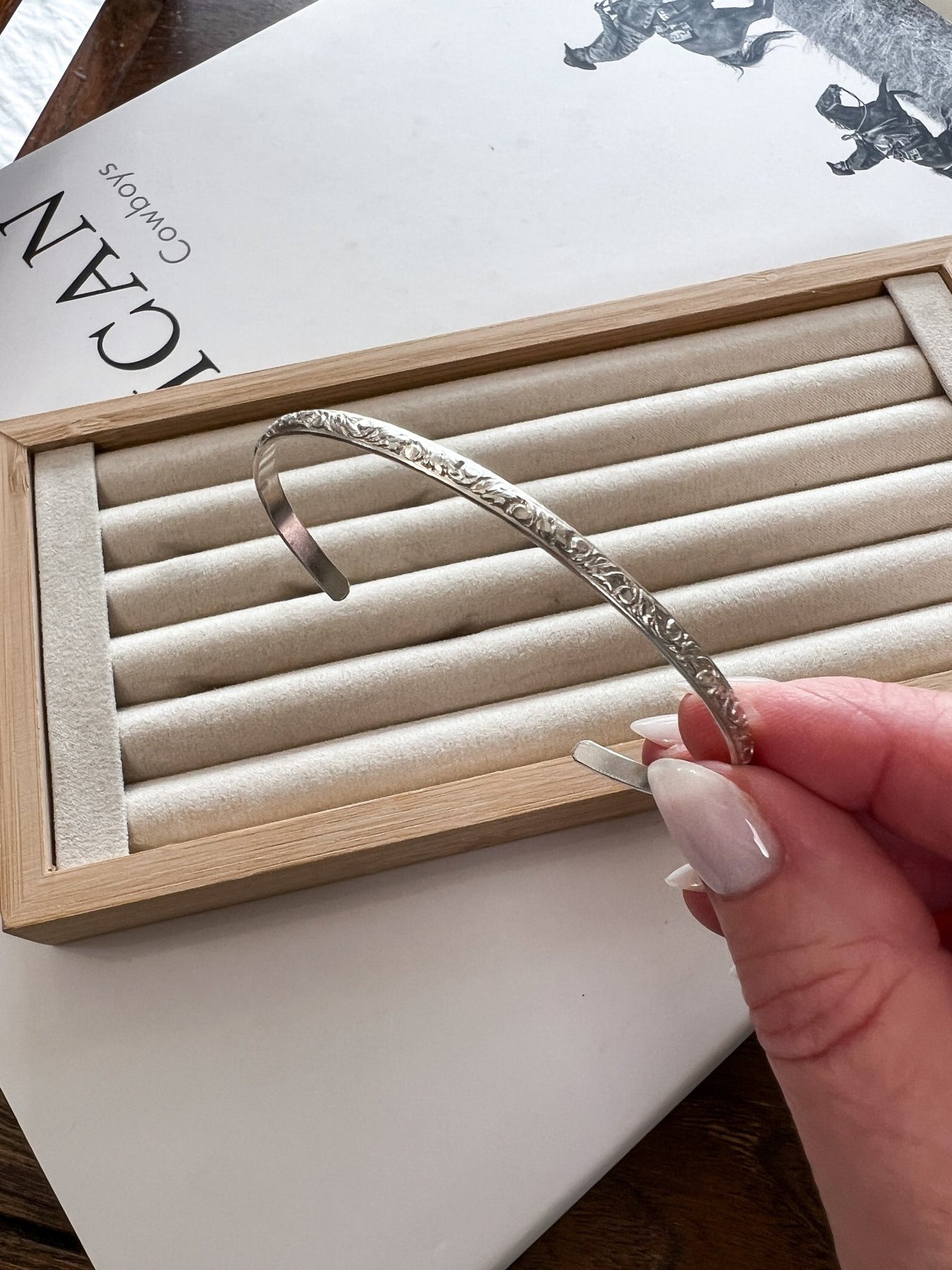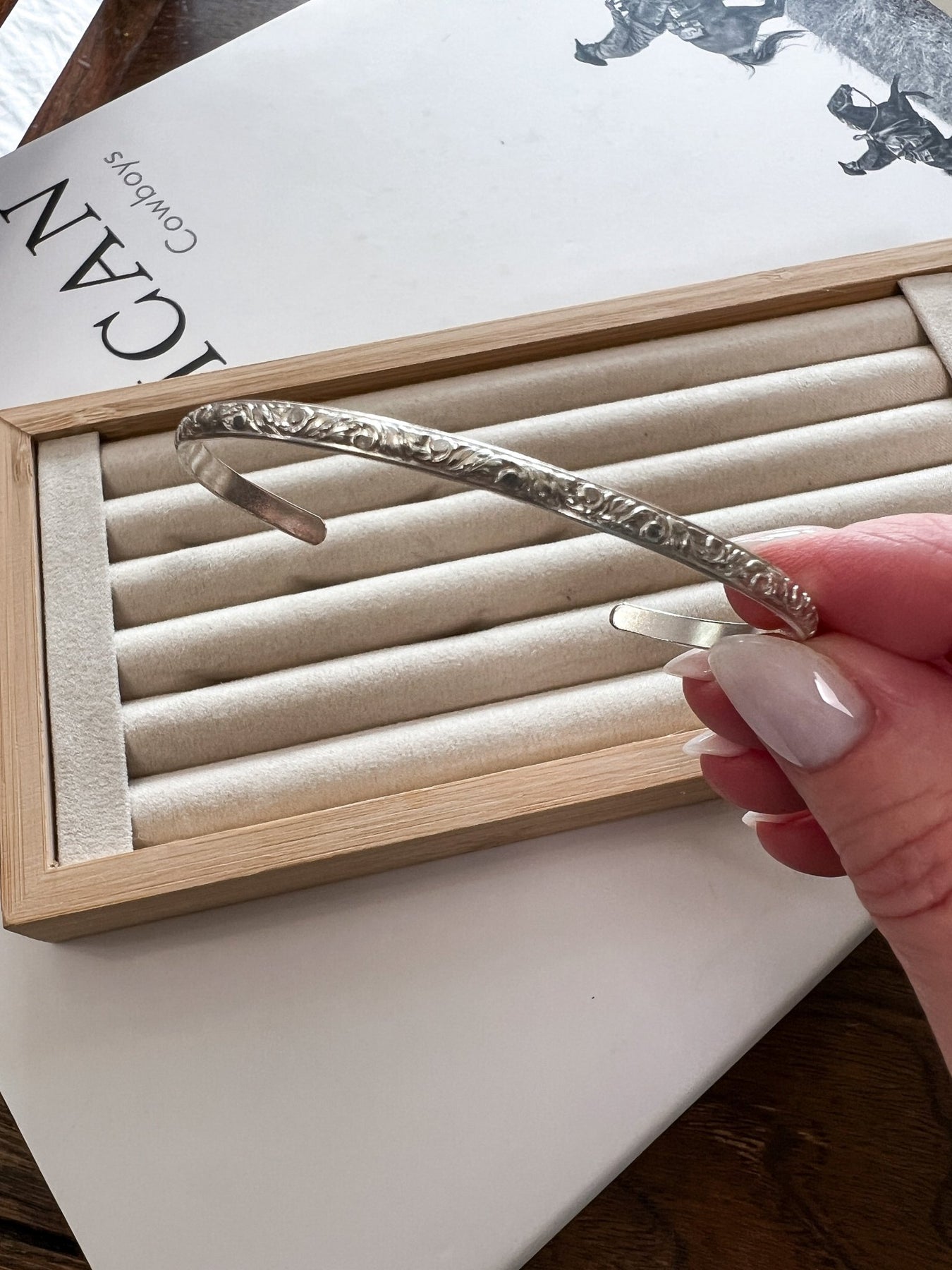 Handcrafted with beautiful engraving, this sterling silver cuff carries a touch of vintage charm. Wear it stacked with your favorite bracelets for a bold look or let it shine on its own as a timeless statement piece.