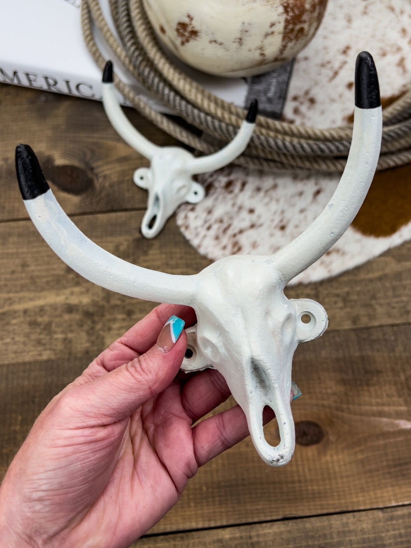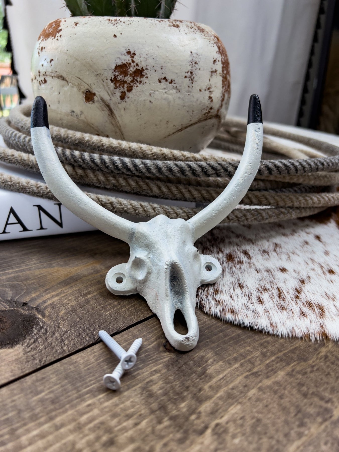 Revamp your interior with Western flair using our steer head wall hook. Made of durable cast iron and a hand-painted finish, the two sturdy horns serves as functional and decorative piece.
