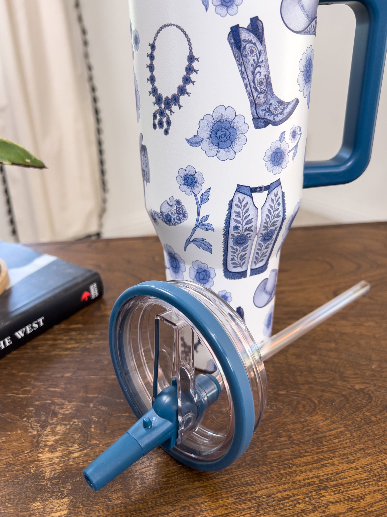 Stay refreshed with this 40oz stainless steel tumbler, where timeless elegance meets a modern western twist. Designed with a convenient flip top lid for easy sipping on the go, it keeps drinks warm for up to 6 hours and cold for up to 12. The sleek shape fits perfectly in most cup holders, while the non-slip bottom keeps it steady wherever the day takes you.