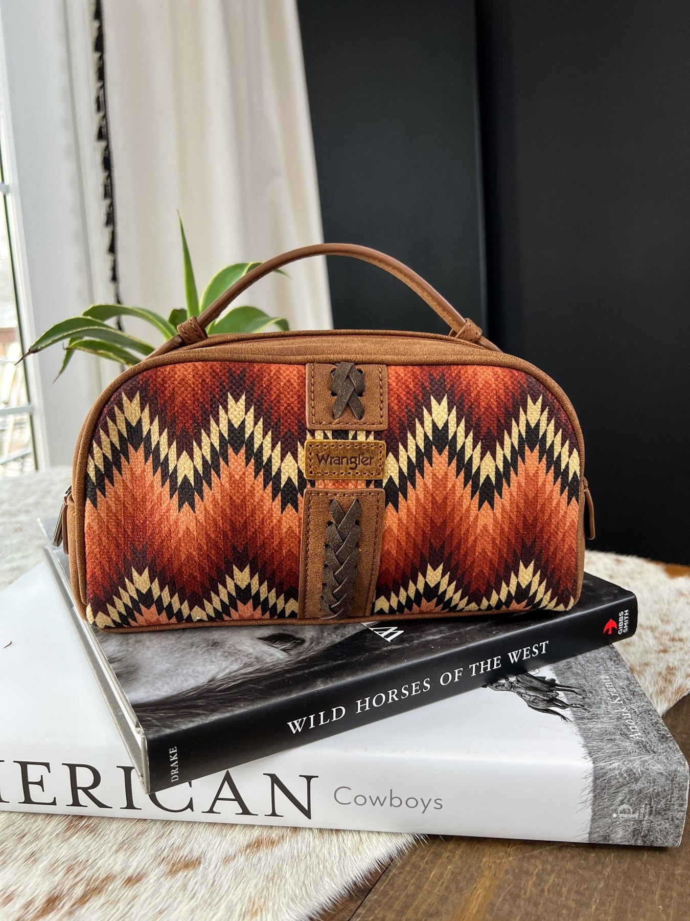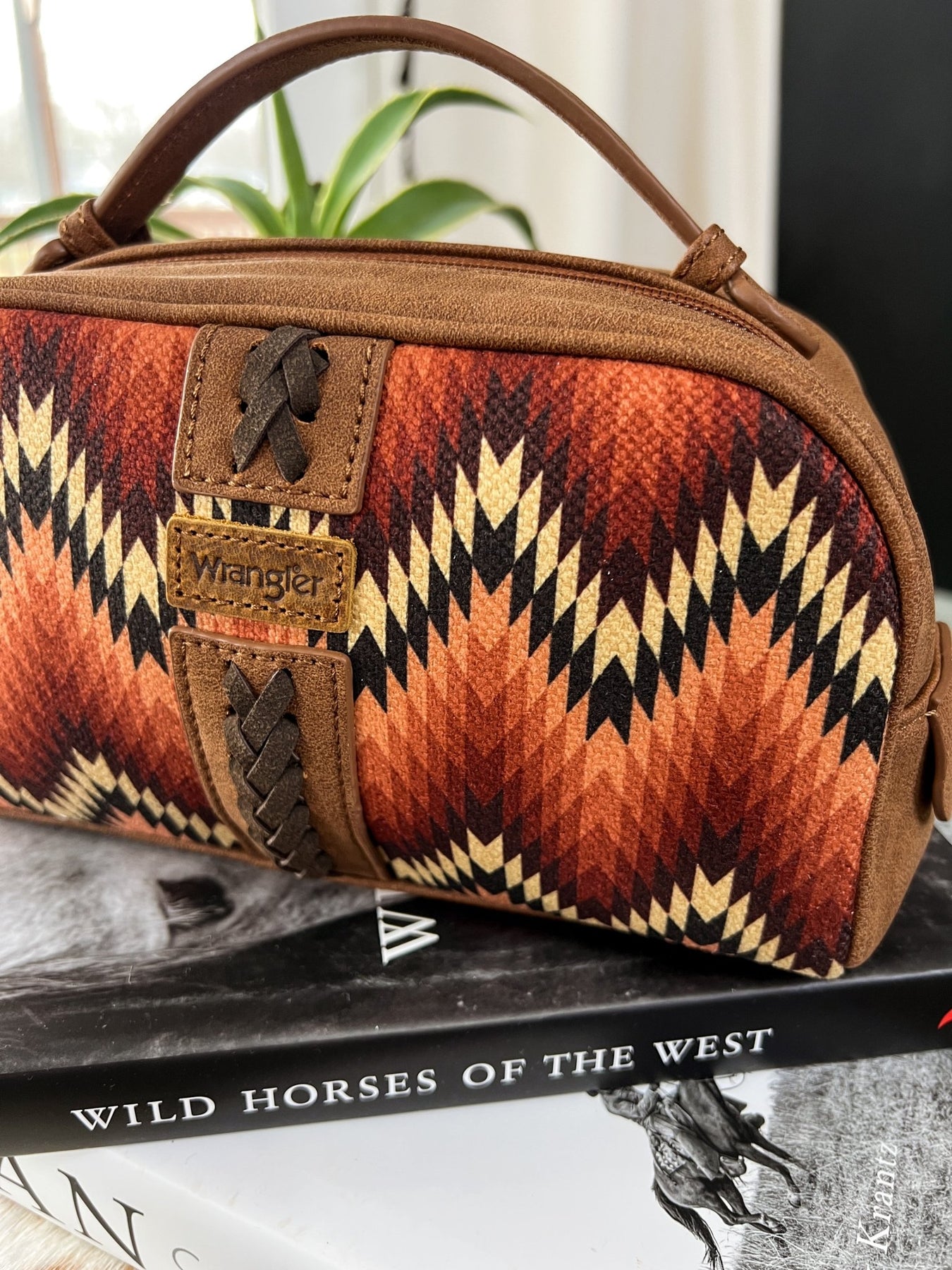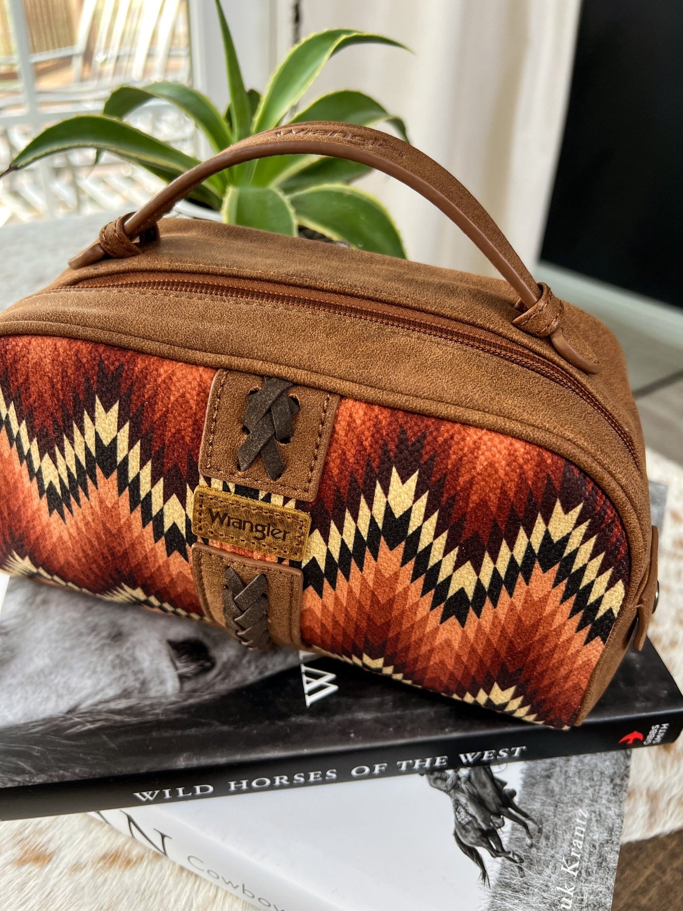 Made with durable canvas on the front featuring a gorgeous southwestern print, this bag is perfect for all your small travel accessories. The whipstitch detail adds a touch of charm to this spacious and reliable travel essential.