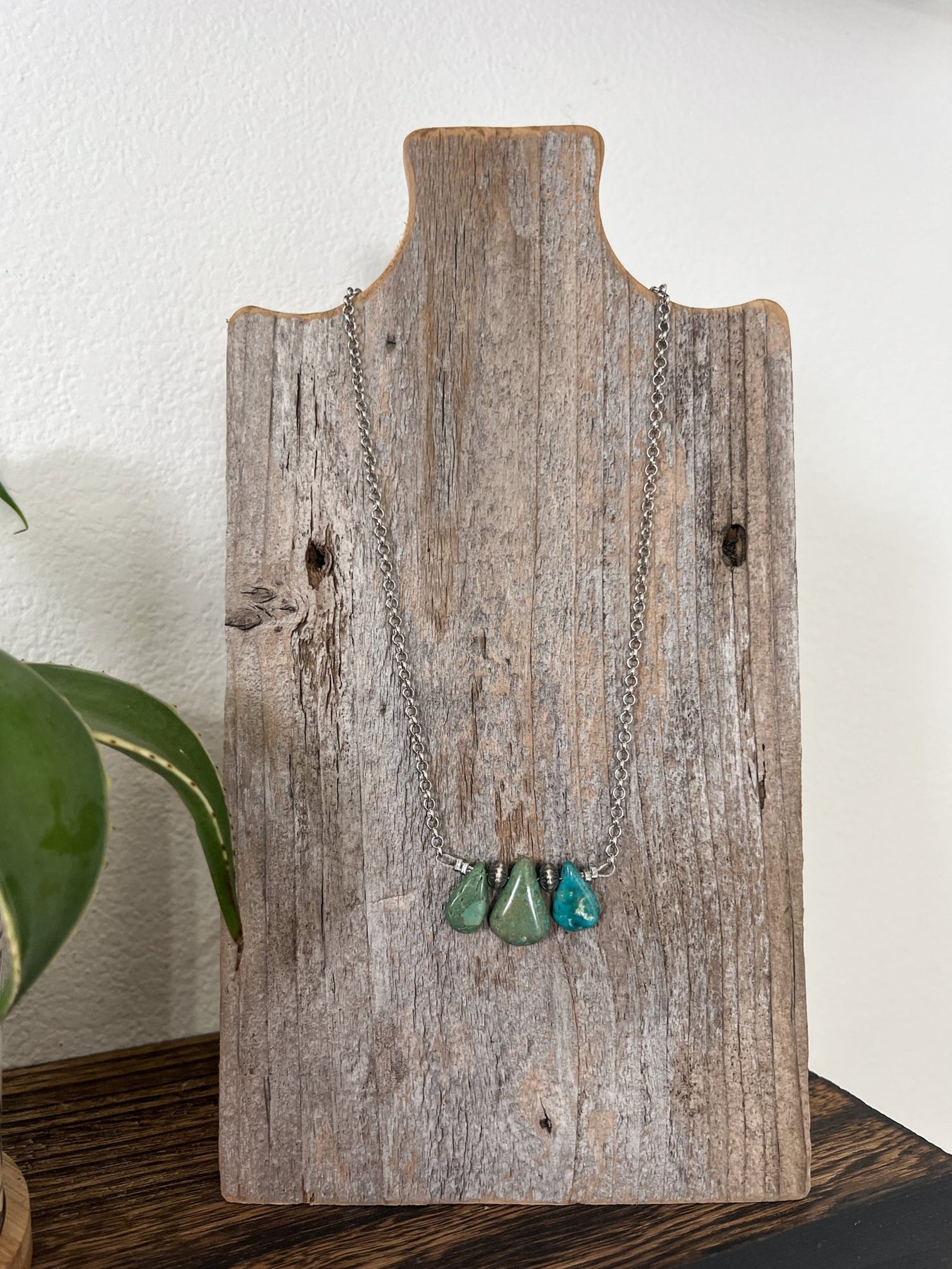 This stunning necklace features real turquoise and sterling silver saucers on a paper clip chain that measures 14 inches in length. The turquoise teardrops, each uniquely shaped and colored, are expertly handcrafted with care.