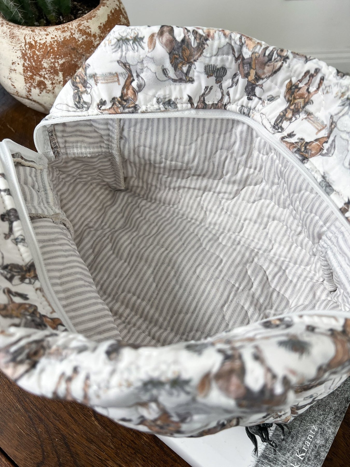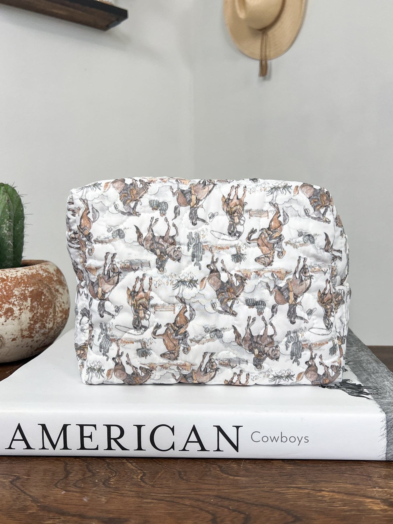 Every stitch tells a story. Our quilted makeup bag is lovingly handcrafted in Texas, combining timeless quilting with practical design. With a roomy compartment and soft western-inspired patterns, it’s built to hold your beauty essentials in style. Durable, washable, and made with care—this bag is made to go wherever life takes you.