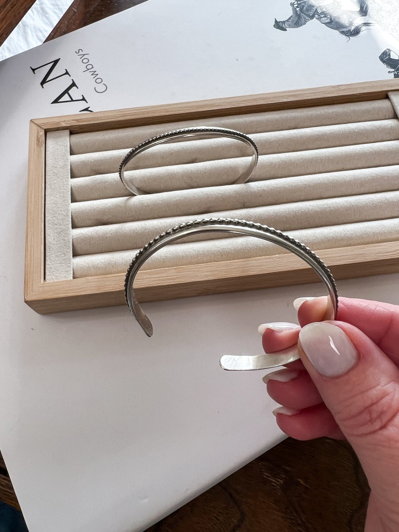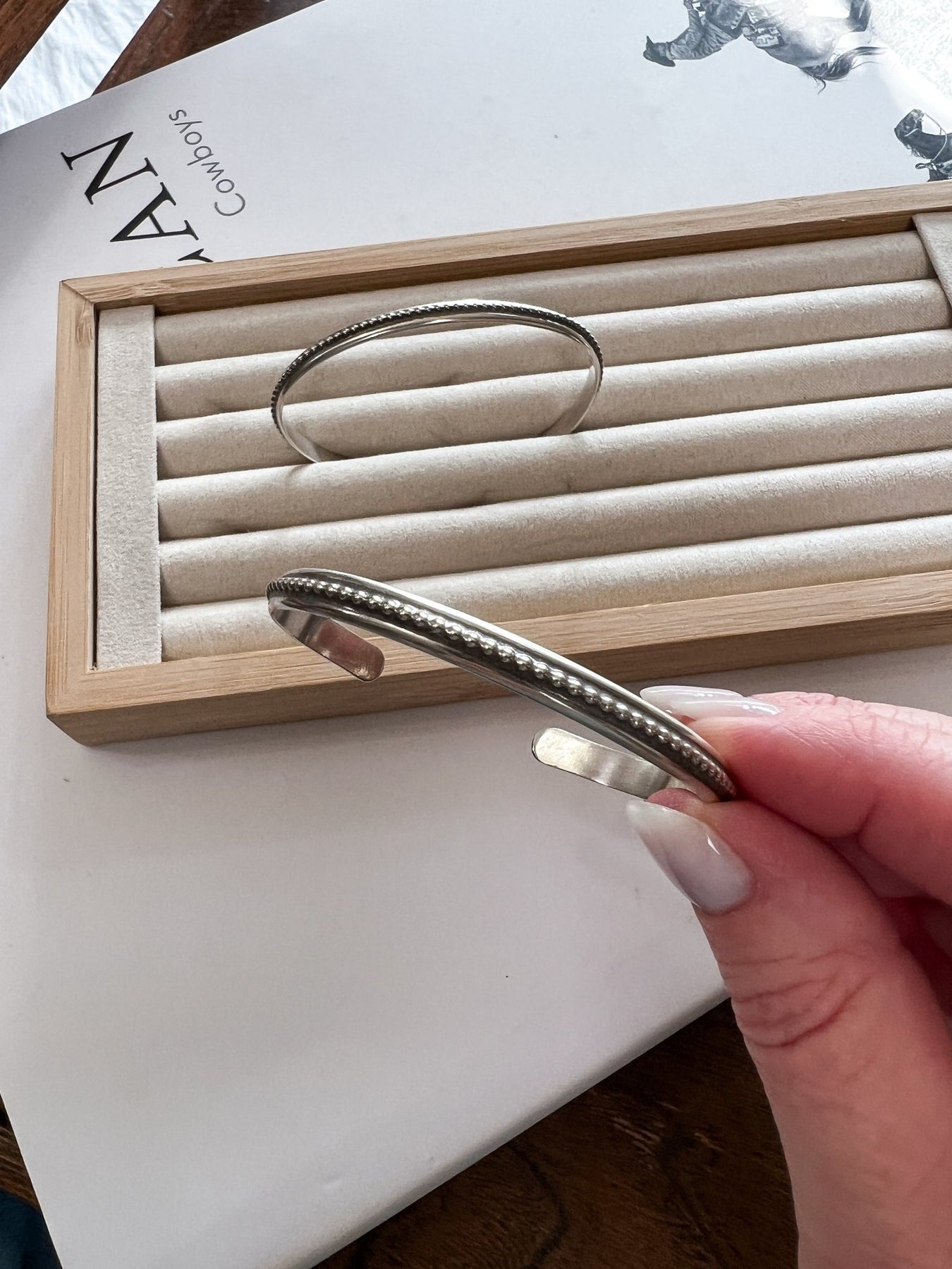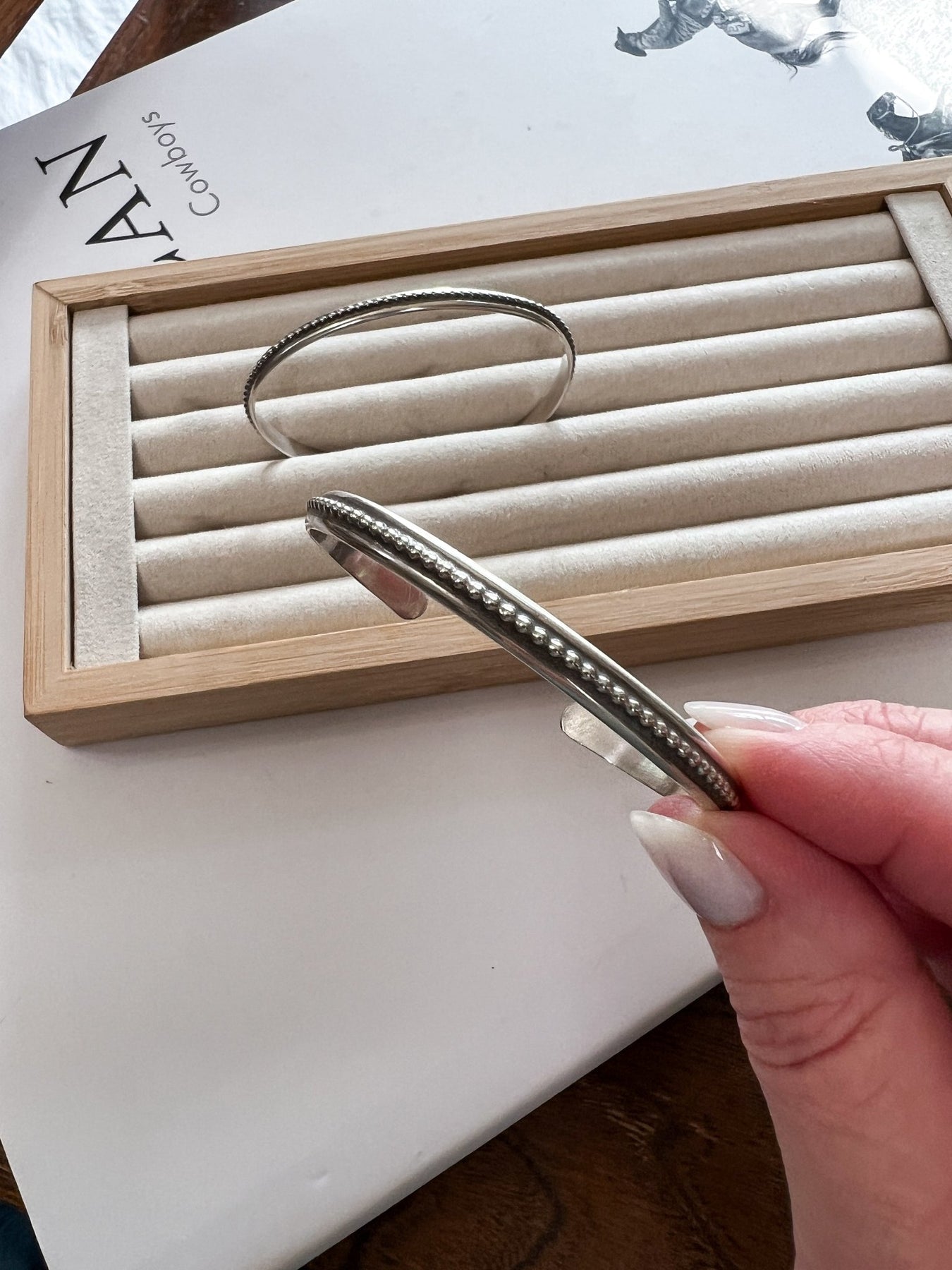Experience the elegance and durability of the Palmer Beaded Cuff Bracelet. Beautifully crafted with 5mm sterling silver, this cuff features a unique beaded design that adds a touch of sophistication to any outfit. A must-have accessory for those who appreciate quality and style.