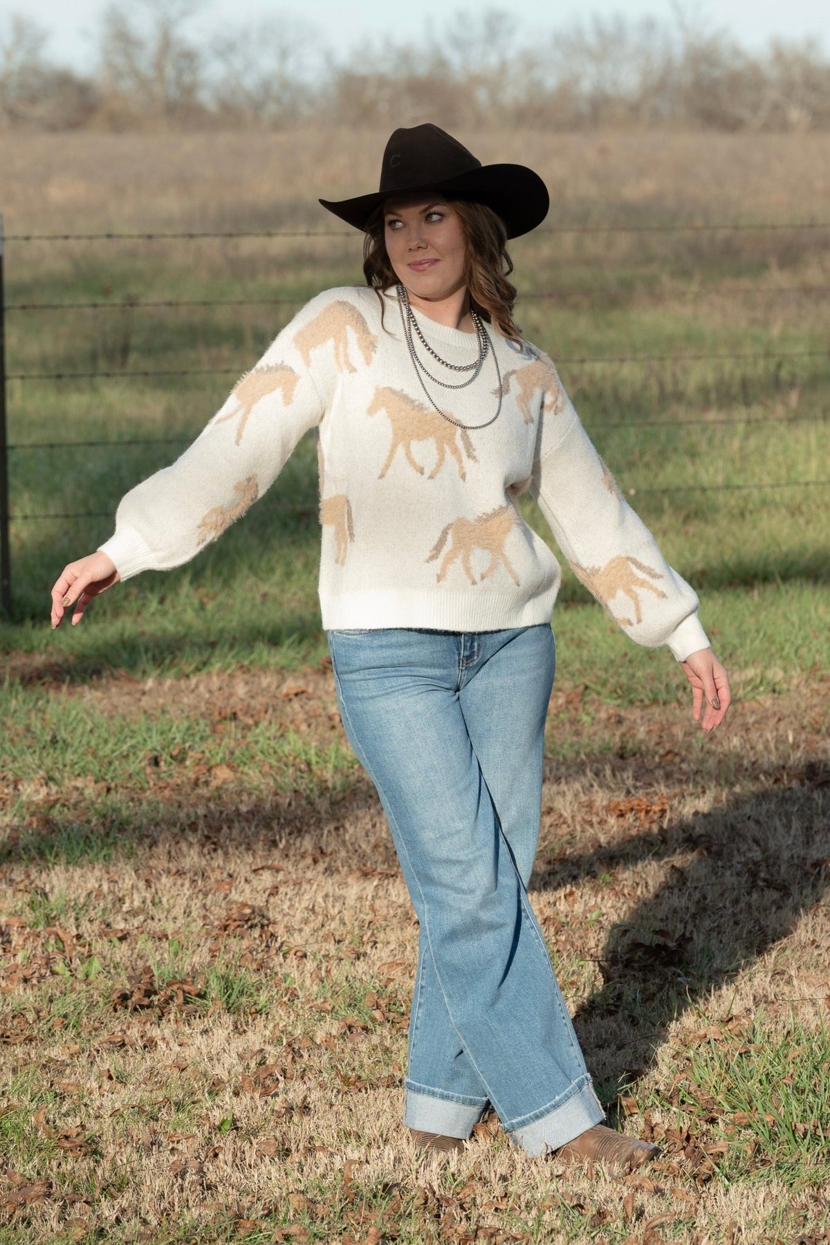 Soft, cozy, and full of character, this sweater features a charming galloping horse motif in warm tan tones. Crafted from a plush knit that feels soft against the skin, it offers a classic fit with ribbed trims for a polished touch. Perfect for pairing with tailored trousers or casual denim, it blends whimsical design with timeless comfort.