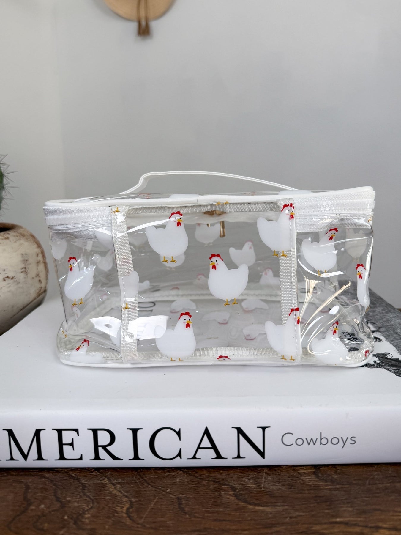 The see through construction eliminates the guesswork when searching for your favorite products, while the whimsical white chicken graphic adds instant personality to your travel kit. Reinforced with a sleek white zipper, this bag handles daily touch ups and weekend trips with ease.